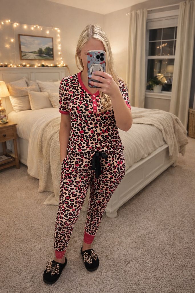 Short sleeve top and jogger style drawstring waist bottoms